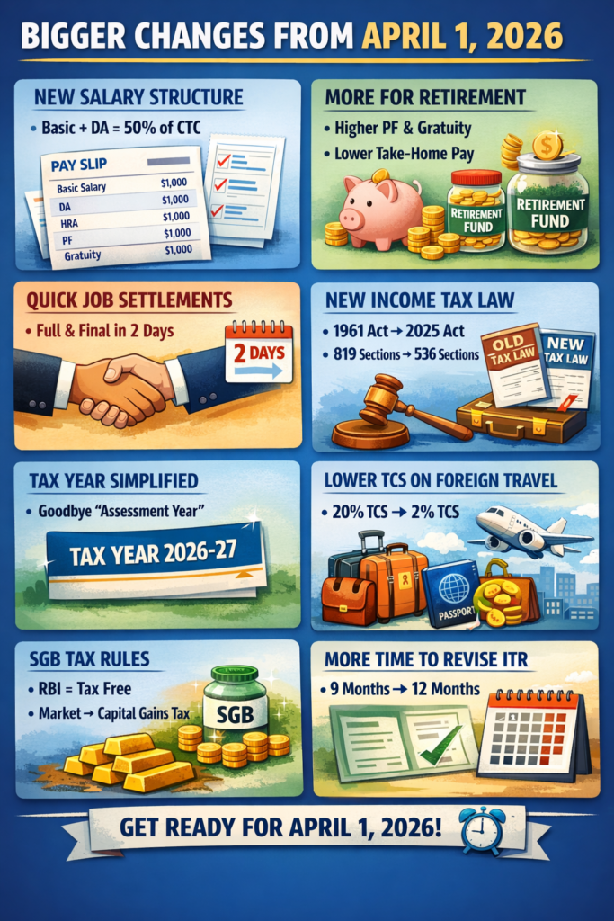 India is set to witness a significant transformation in its labor and taxation framework starting April 1, 2026. These changes will directly impact salaried employees, businesses, and taxpayers across the country. From how your salary is structured to how quickly you receive your dues after leaving a job, the new rules aim to bring transparency, simplicity, and financial security.
